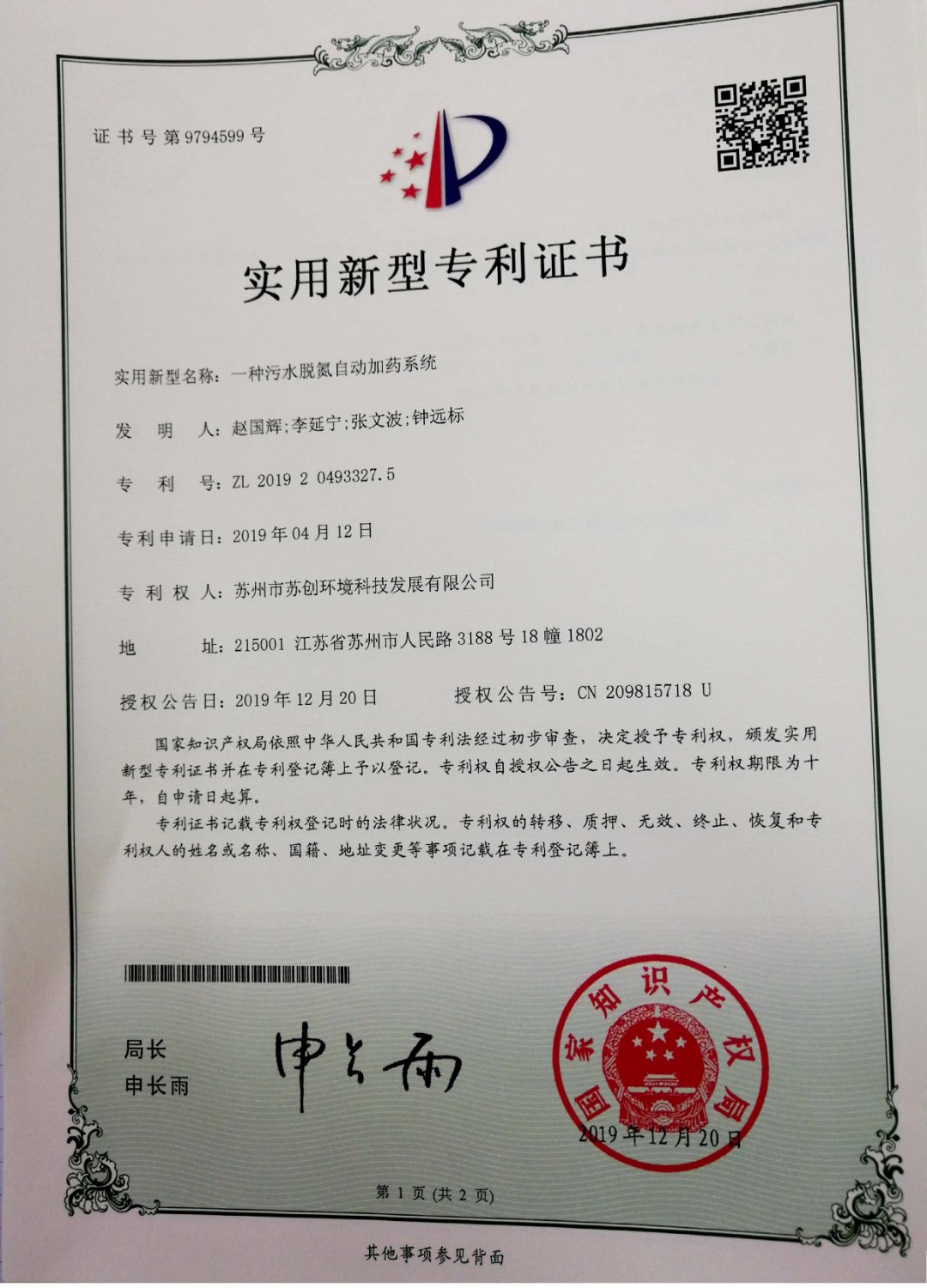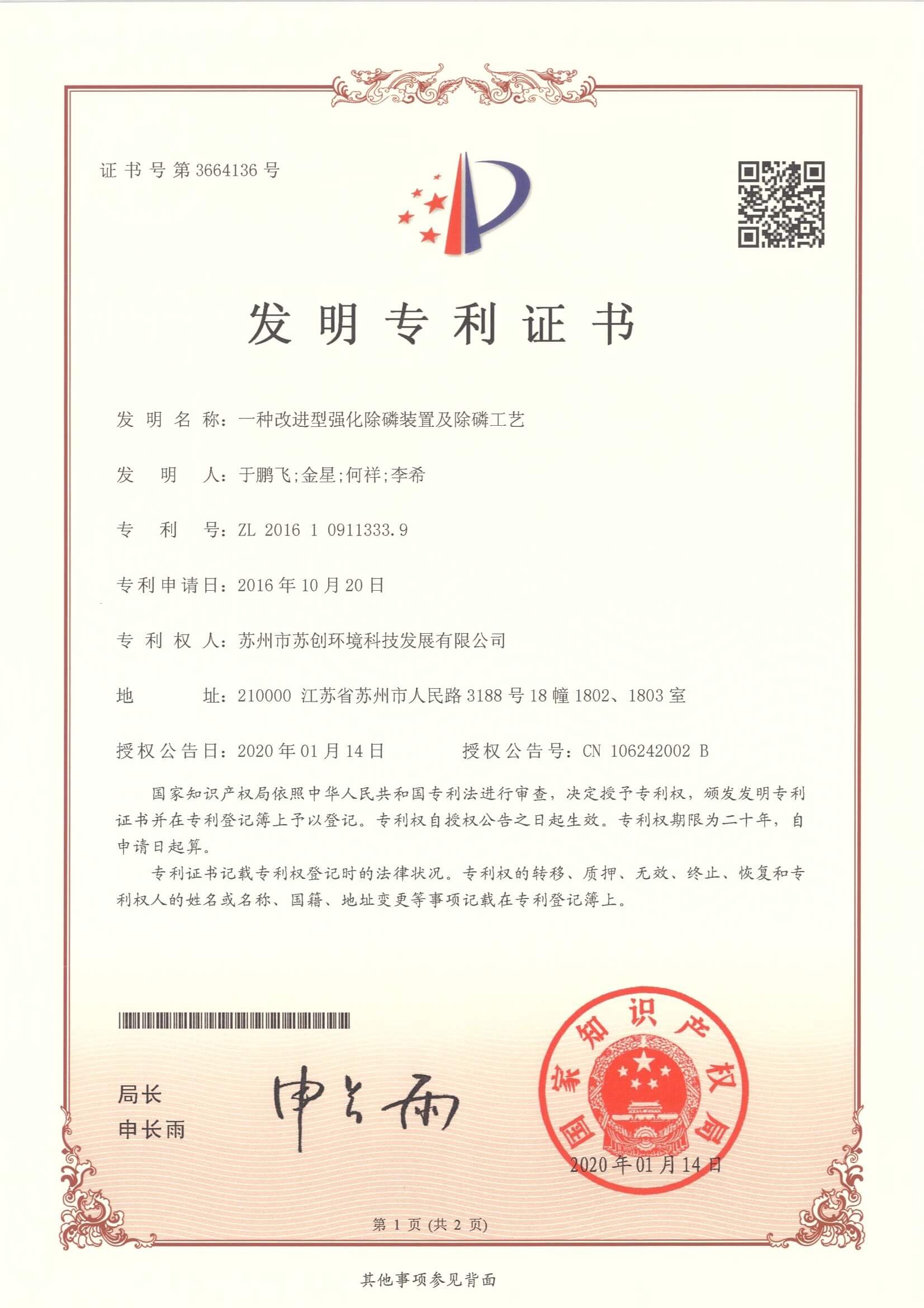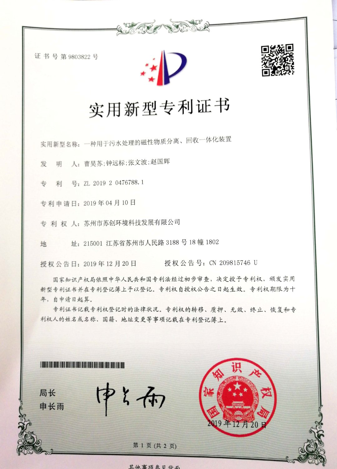 磁分離+反硝化+曝氣生物濾池一體化裝備 采用磁沉淀和曝氣生物濾池相結(jié)合的水體凈化工藝蘇創(chuàng)環(huán)境 · 專利與榮譽(yù)成果
